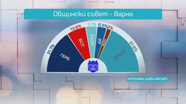 Във Варна ГЕРБ също води с 31,7%, следвана от БСП – 13,6%.