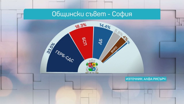 В София ГЕРБ печели 33,5%, следвана от БСП – 18,3%. За листата със съветниците на „Демократична България” са гласували 14,4%.