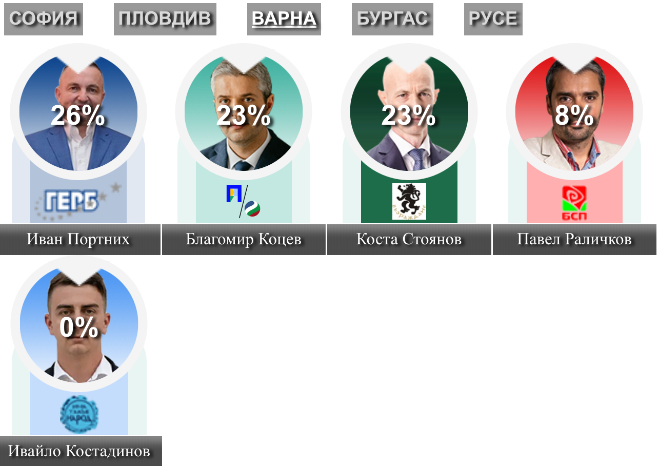 Във Варна първи е Иван Портних, а за второто място се борят Благомир Коцев от ППДБ и Коста Стоянов от "Възраждане".