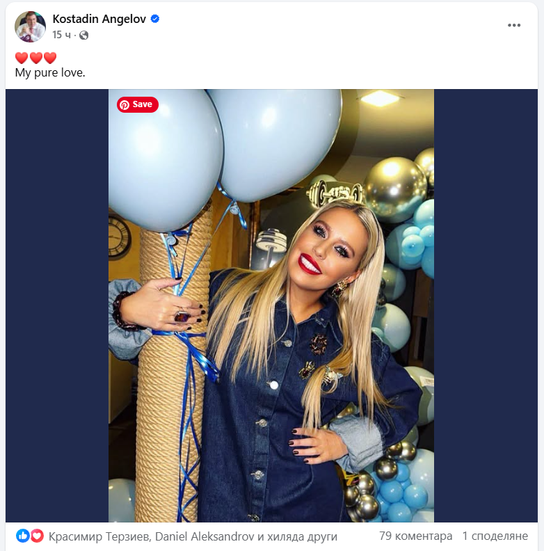 Към снимката на съпругата си Костадин Ангеров добави сърца и посланието "Моята чиста любов". Не стана ясно каква точно е причината за това романтично признание. Кадарът подсказва, че е от рожден ден, но този на Илияна е чак след три месеца - на 19 февруари.