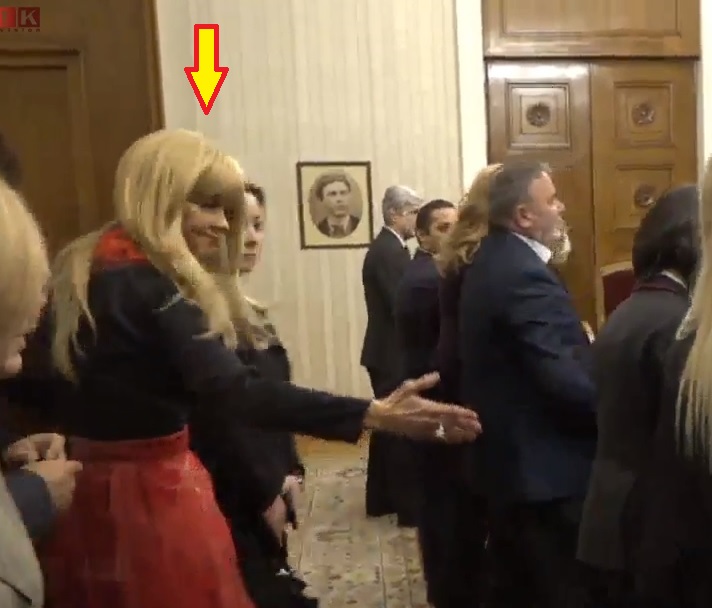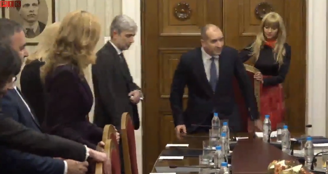 После засуканата русокоска потъна в посока кабинета на Румен Радев и след известно време се появи заедно с него, като дори му отвори и задържа вратата.
