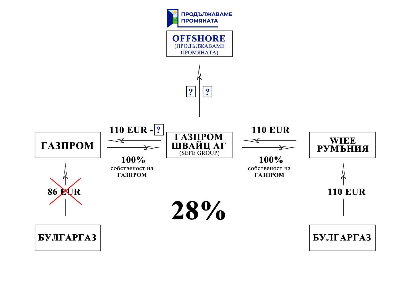 Припомняме, че от ГЕРБ обясниха, че вместо страната ни да купува газ на 86 евро директно от "Газпром", тя го купува от дъщерната компания на "Газпром" в Румъния на стойност от 110 евро. Парите от румънската компания отиват в друга дъщерна компания на "Газпром", в Швейцария, а оттам част от сумите се преразпределят в офшорки.