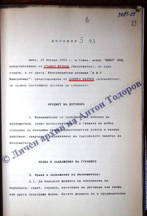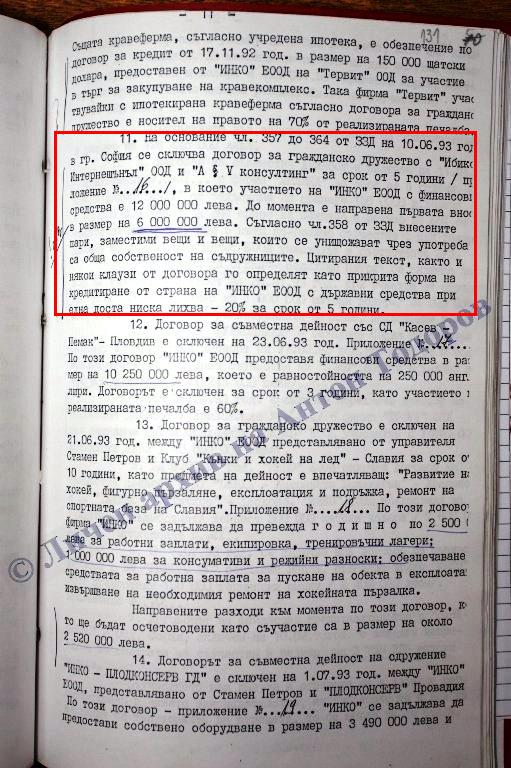 „Направи ли Ви впечатление този договор, сключен между "Инко" и "Ивикоинтернешънъл" и същата юридическа къща "А и V консултинг" за съвместно гражданско дружество - чл. 357 от ЗЗД, където "Инко" ще даде 12 милиона. А други ще дават юридически съвети и ще уредят правото на строеж. И парите стават обща собственост, пък всеки си запазва собствеността."