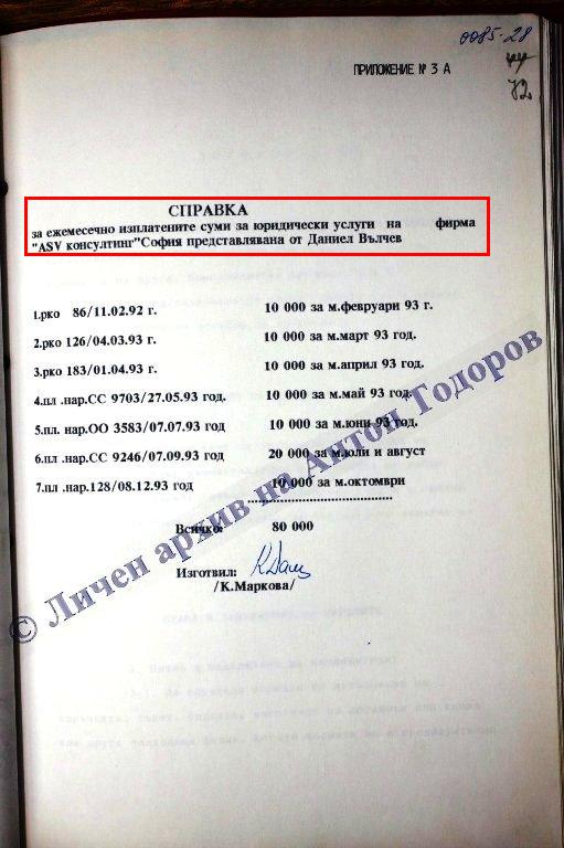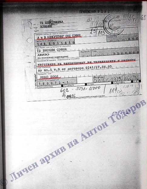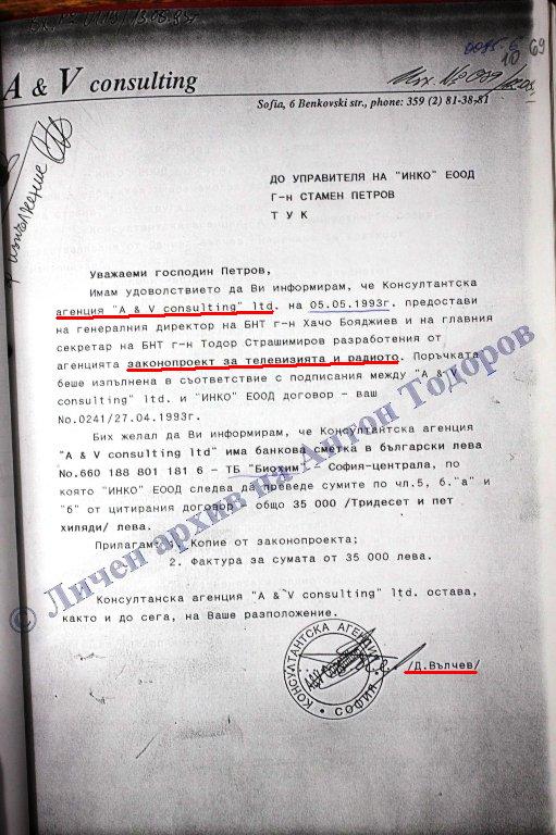 „По сметка 602 "Разходи за външни услуги" е отчетен разход от 50 000 лева, съгласно договор от 25.04.93 г. с фирма "А и В консулт". Договорът касае разработка на проектозакон за радиото и телевизията, който да бъде предаден на „Инко" като възложител. Законопроекта е представен лично на г-н Хачо Бояджиев /съгласно писмо на „А и В консултинг" №0119/13.05.93 г/, а е изплатен от „Инко" Еоод. Не е ясно от договора каква е икономическата потребност на "Инко" и защо разходите се третират като необходимо присъщи за стопанската дейности… Икономически необосновани са изплащаните ежемесечно суми за юридически услуги на "А § V консултинг" и "B § H консулт" в размер на 27 000 лева. В същото време, фирмата е работила с назначен по трудов договор юрист...Драстично е изплащането на посочените възнаграждения, тъй като от предоставяните на ревизията договори не става ясно дали са съгласувани с юрист и с кой от юристите. Много от сключените договори съдържат клаузи, накърняващи интересите на "Инко" ЕООД. Такива са посочените в договорите приложения за съвместна стопанска дейност, за финансово управление, за реклама, за изграждане на жилища и други.“