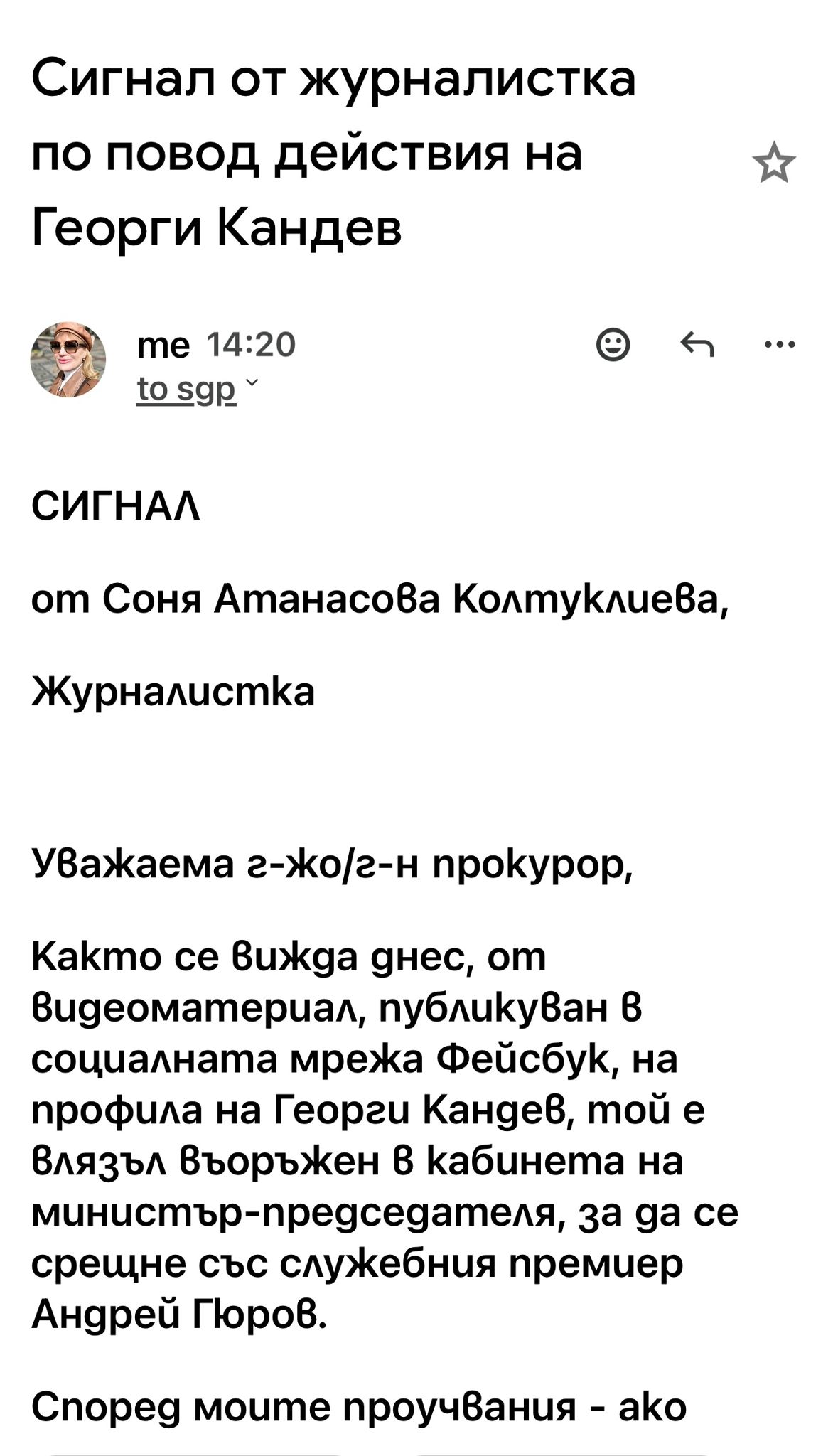 Току-що изпратих сигнал до Софийска градска прокуратура по следния повод: както се вижда днес от видеоматериал, публикуван в социалната мрежа Фейсбук, на профила на Георги Кандев, той е влязъл в кабинета на министър-председателя, за да се срещне с Андрей Гюров.