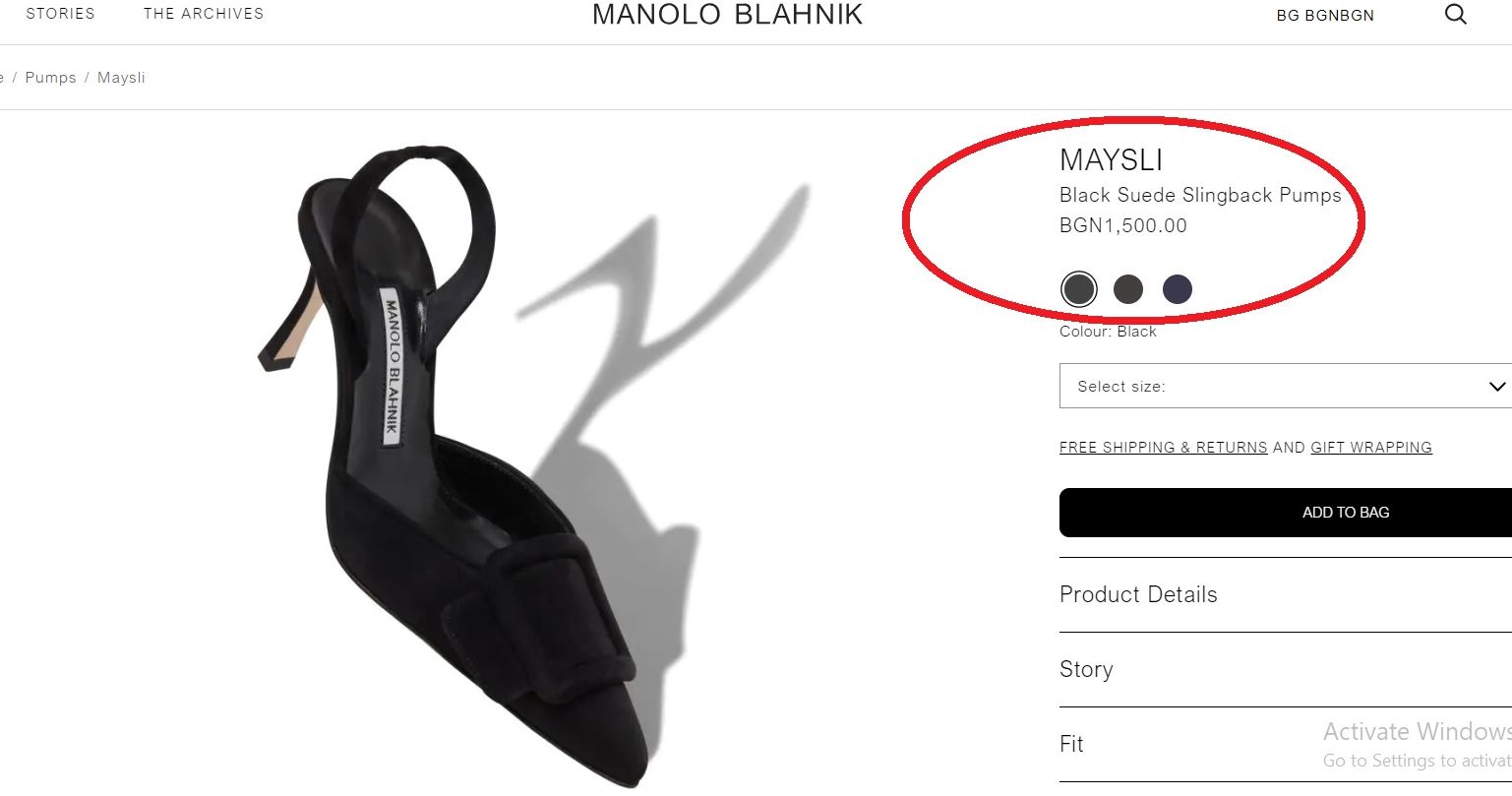 Доста по-скъпи са заострените черни цепици с декоративна панделка, върху които се е качила президентската съпруга. През есента на 2023 г. моделът присъства в последната колекция на испанския дизайнер Маноло Бланик, известен като Повелителя на високия ток. Онлайн токчетата са вървели на цена от 1500 лева.