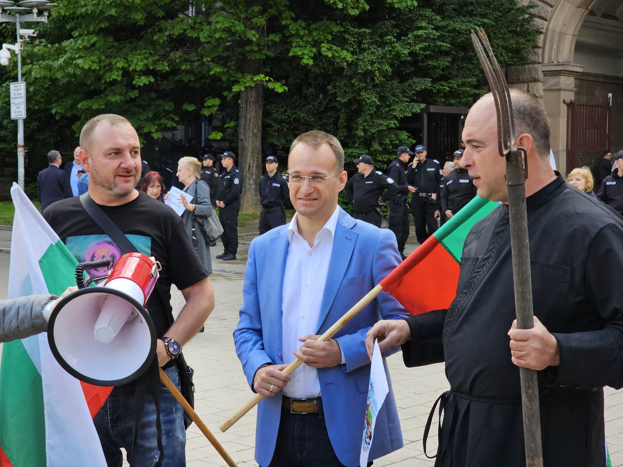 Напрежението на протеста ескалира при пристигането на представителите на "Промяната", които трябва да получат мандата. Присъстващите освиркаха появата на акад. Денков и компания.