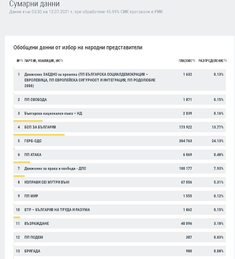 Централната избирателна комисия (ЦИК ) публикува обобщени данни към 03:30 часа при обработени 45.99% СИК протоколи в РИК.