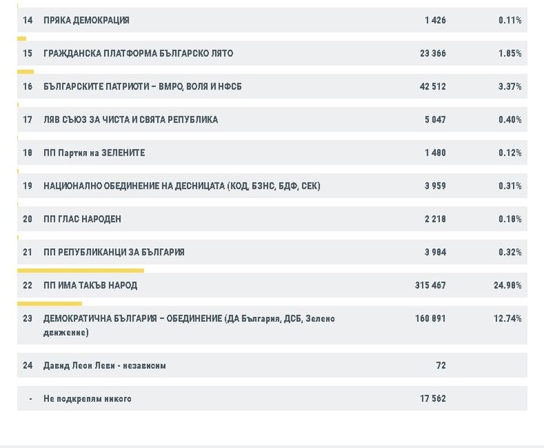 Партията „Има такъв народ” (ИТН) води с 24.98% от гласовете.Следват ГЕРБ с 24.13%.