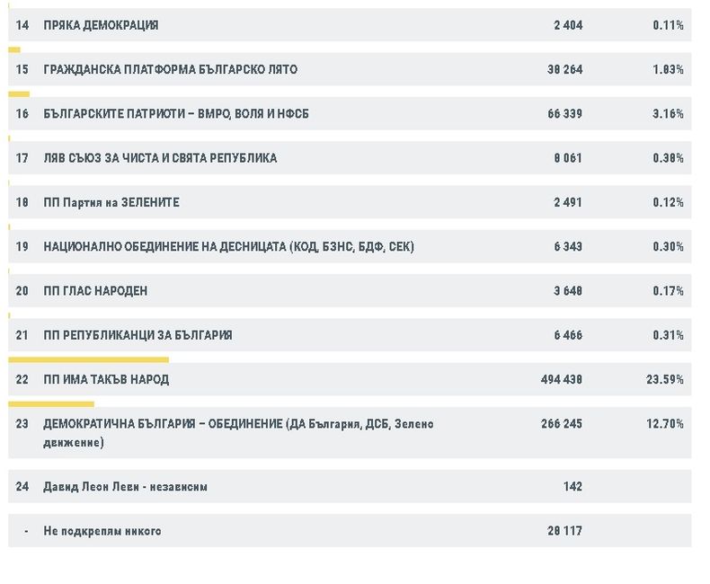 Трета политическа сила е КП "БСП за България" с 13.74%. „Демократична България” е с 12.70%, а ДПС – с 10.33%. „Изправи се! Мутри вън!” има 5.08 %.