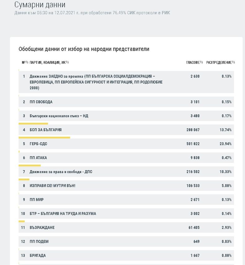 Централната избирателна комисия (ЦИК ) публикува обобщени данни към 05:30 часа при обработени 76.49% СИК протоколи в РИК.
