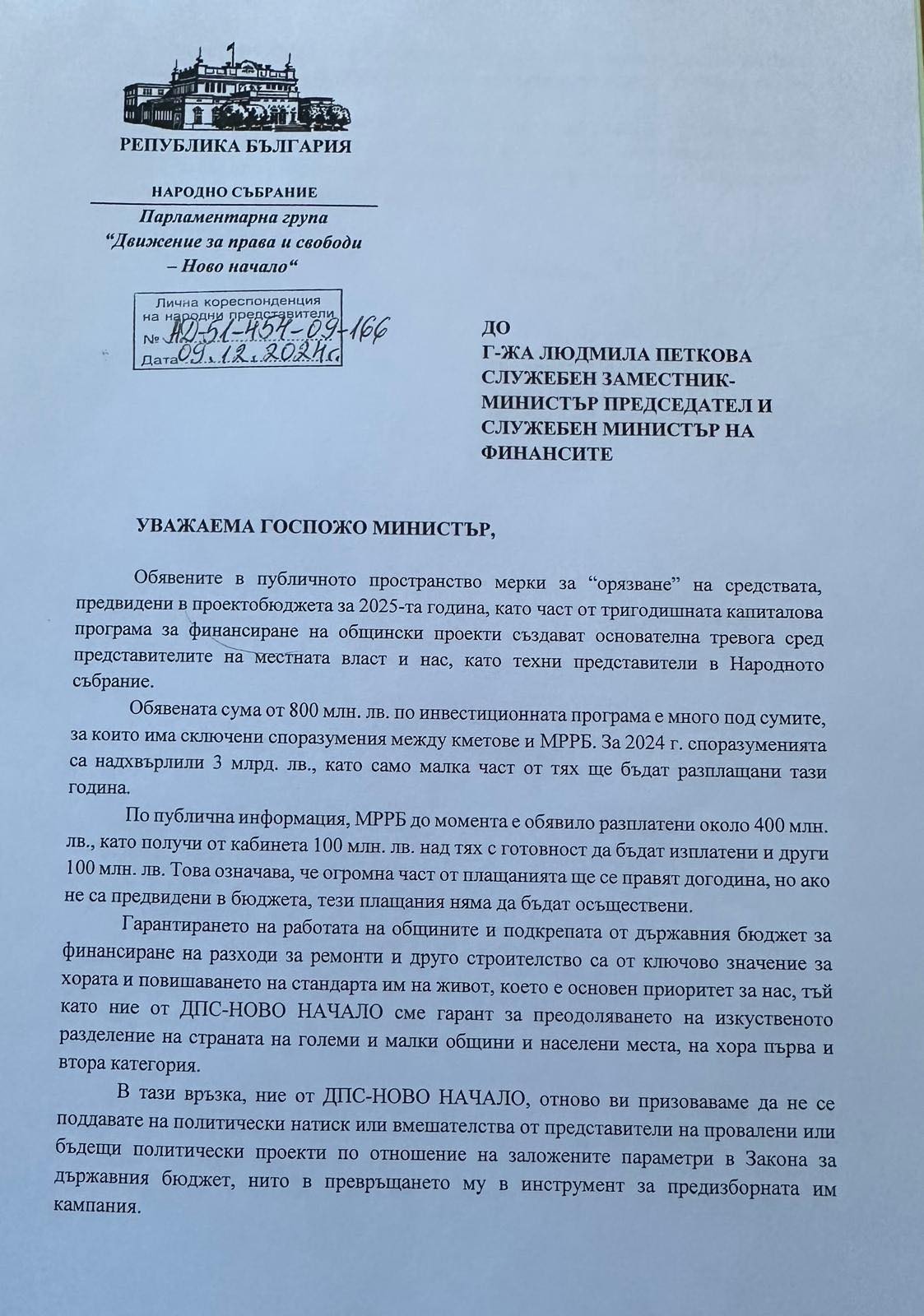 Срещу орязването на бюджета за инвестиционната програма на общините за 2025-та година се обяви в писмо до служебния министър на финансите Людмила Петкова председателят на ПГ ДПС-НОВО НАЧАЛО Делян Пеевски.