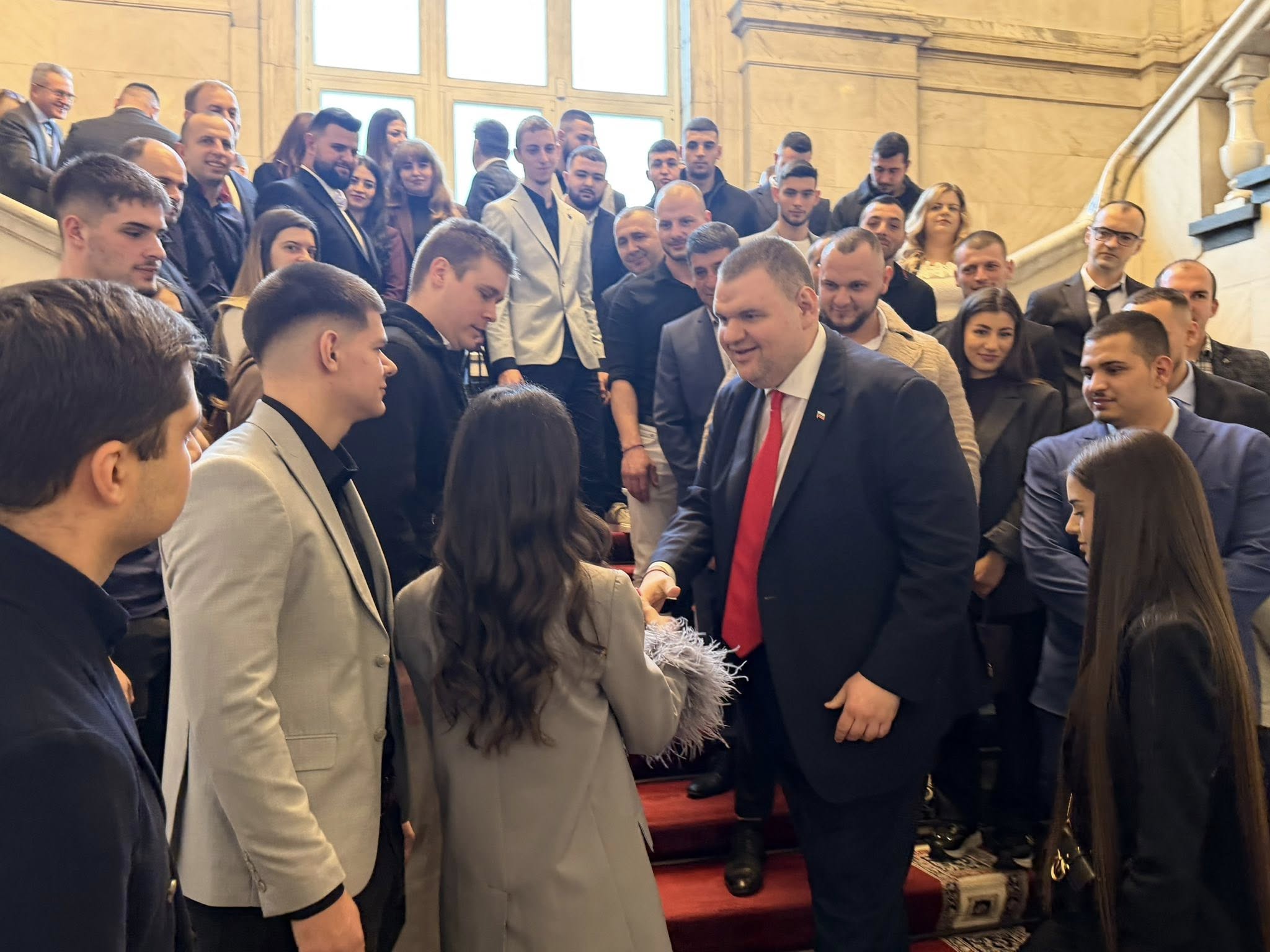 Лидерът на ДПС и ПГ на ДПС-НОВО НАЧАЛО Делян Пеевски се срещна с голяма група младежи от област Пазарджик, които посетиха Народното събрание и Музея на Сглобката, разположен в кабинет 222А.