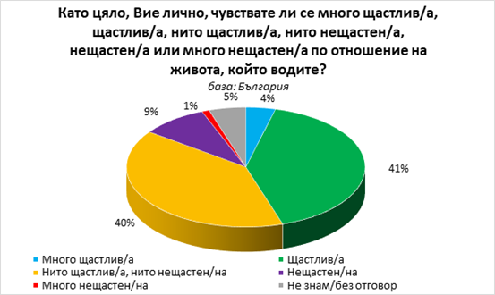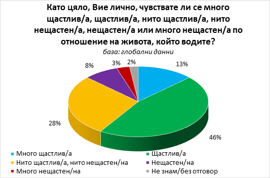 В края на 2019 г. 45% у нас декларират, че са щастливи или много щастливи, а 10% са нещастни или много нещастни. 40% са в „средата“ между щастие и нещастие, а останалите не могат да определят. Така нетната стойност на щастие минус нещастие е 35. В предходните години тази стойност се движеше така: 36 (преди две години), 33 (преди три години), 30 (преди четири), 16 (преди пет години). В последните години може би усещането за лично щастие плавно укрепва, но остава далеч от световната средна нетна стойност в индекса на щастието – която сега е 48 и в последните години се колебае около тези нива. Българите са по-нещастни и от средния европеец.