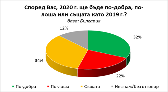 В края на 2019 г. 32% от българите очакват 2020 г. да е по-добра от 2019 г. 22% - по-лоша, а 34% - същата. 12% не могат да отговорят. Така нетната стойност на оптимизма у нас (дялове на оптимисти минус дялове на песимисти) е 10.