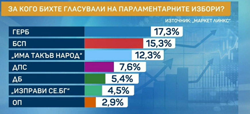 Ново проучване на социологическата агенция "Маркет Линкс" показва електоралните нагласи в страната към днешна дата. Според проучването избирателите на ГЕРБ са мобилизирани и партията им получава 17,3% от всички гласове спрямо 15,3% за БСП.