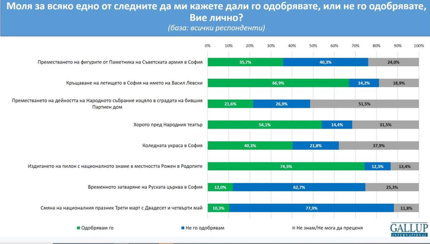 Каква е ситуацията с прословутото хоро пред Народния театър? 54,1% го одобряват, а 14,4% – не. Едва ли обаче популярността на хорото излиза съществено от рамките на социалните медии, затова и спорно е доколко това е действително обществено мнение или става дума също за автоматизъм. В крайна сметка, явно е, че общественият инстинкт е положителен и тук, макар и не без нюанси. В самата София близо две трети одобряват, а само петнайсетина процента са директно против.