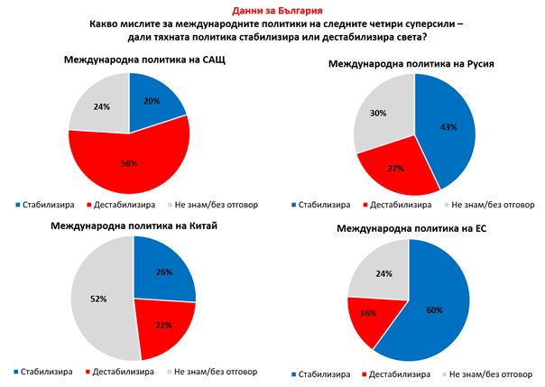 Противоположно, с ниска нетна стойност (-36), е отношението на българите към външната политика на САЩ. По отношение на руската външна политика, 43% от българските граждани са отговорили положително срещу 27% отрицателно, т.е. нетната стойност е +16. Останалите нямат мнение.