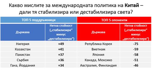 Въпреки, че външната политика на Китай получава също положителна нетна стойност (+4), твърде големият процент (52%) отговорили „Не знам“ сочи по-скоро липса на знание по темата.