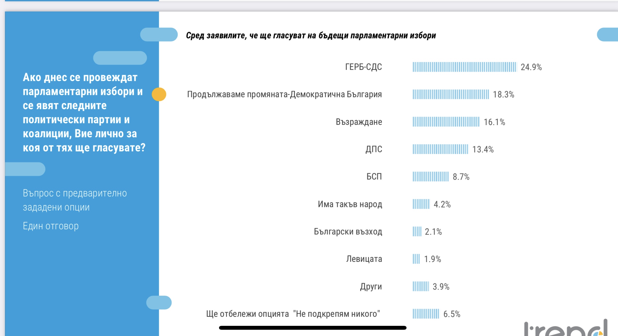 ГОРЕЩО ПРОУЧВАНЕ НА “ТРЕНД”: ГЕРБ бие с много ППДБ - 24,9 на 18,3%. “Възраждане” се доближава до второто място. Все повече хора искат нови избори. Рекордно ниско одобрение на кабинета (ГРАФИКИ)