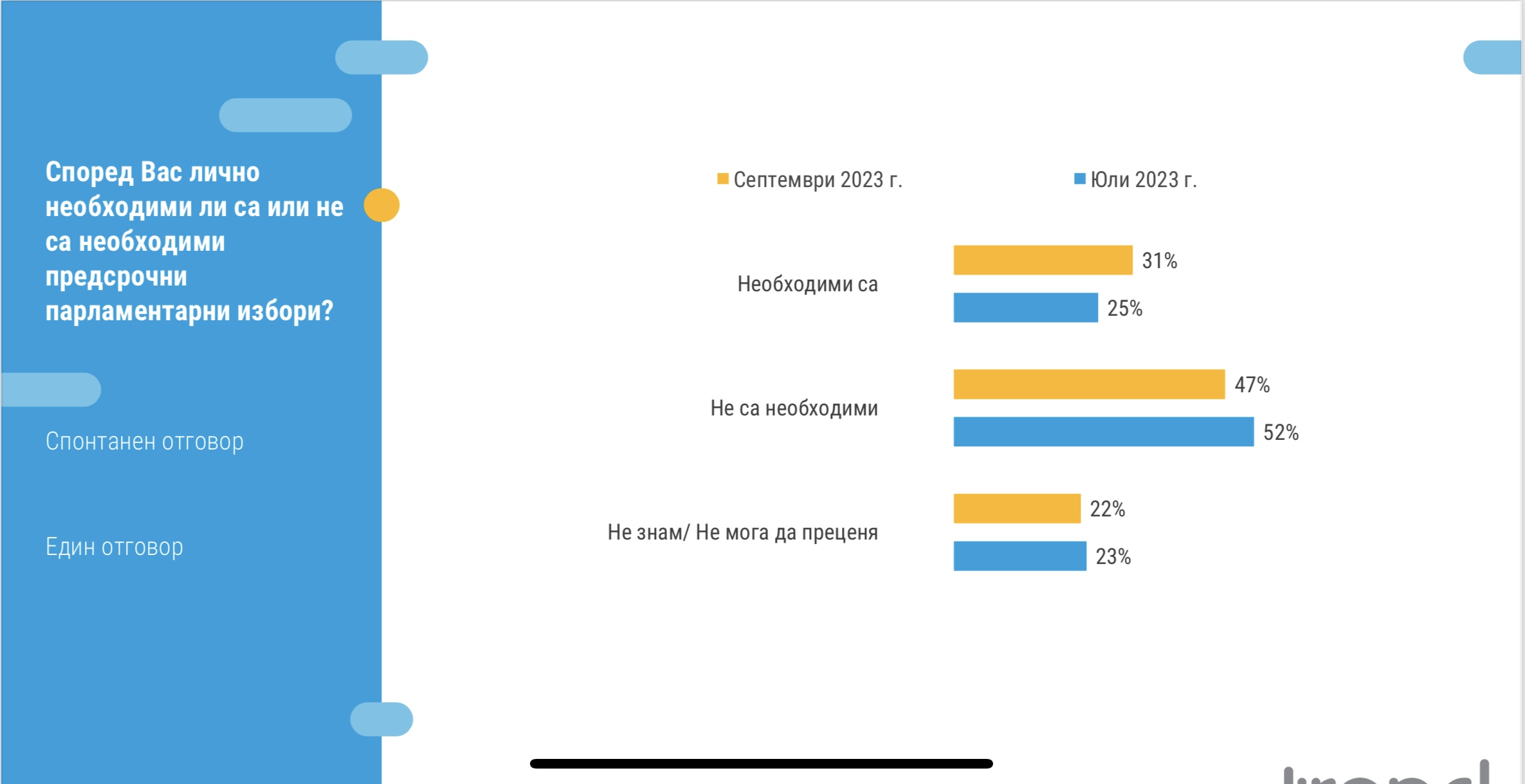 Привържениците на идеята за нови парламентарни избори се покачват с 6% спрямо проучването през юли, като този месец достигат 31%. Въпреки това, мнението, че не са необходими предсрочни парламентарни избори се споделя от близо половината (47%) от българите.