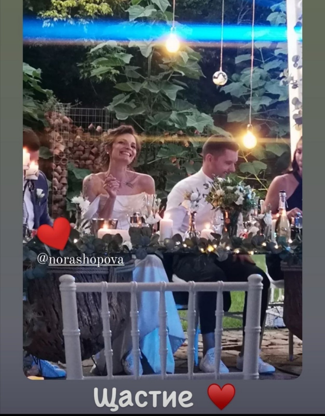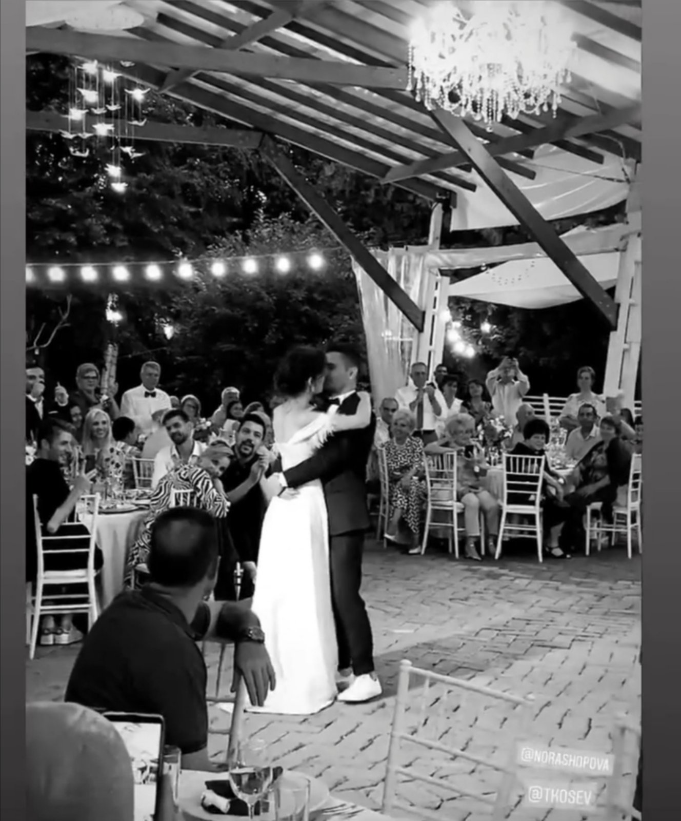 Локацията на тържеството все още не е известна. Нора блести в изчистена булчинска рокля с голи рамене. За веселата част Шопова замени официалните обувки с маратонки.