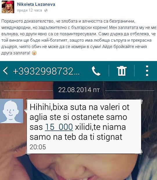 Половинката на нападателя показа във "Фейсбука" си как е получила есемес от непознат номер в който пише: "Биха шута на Валери от Англия, ще си останете само с 15 000, те няма само на теб да ти стигнат."