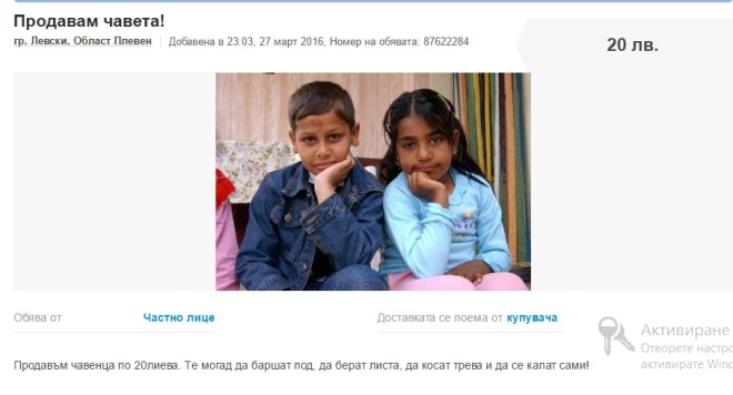 Скандалната обява, за която е редно ту-такси прокуратура и МВР да се самосезират, е публикувана в интернет платформата за онлайн пазаруване olx.bg. Офертата идва от плевенската община Левски, а невръстните деца са представени като „чавенца“, които могат да бъдат експлоатирани и като домашни помощници. Продажбата им е категоризирана като „Домашни любимци“.