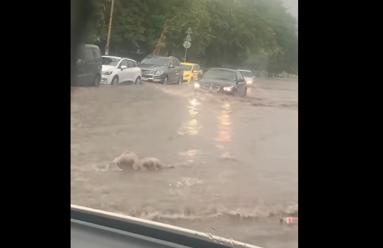 Проливен дъжд наводни и столичния квартал Красна поляна. Кадри от плуващи в потеклите мътни води по улиците коли публикуваха очевидци в социалните мрежи.