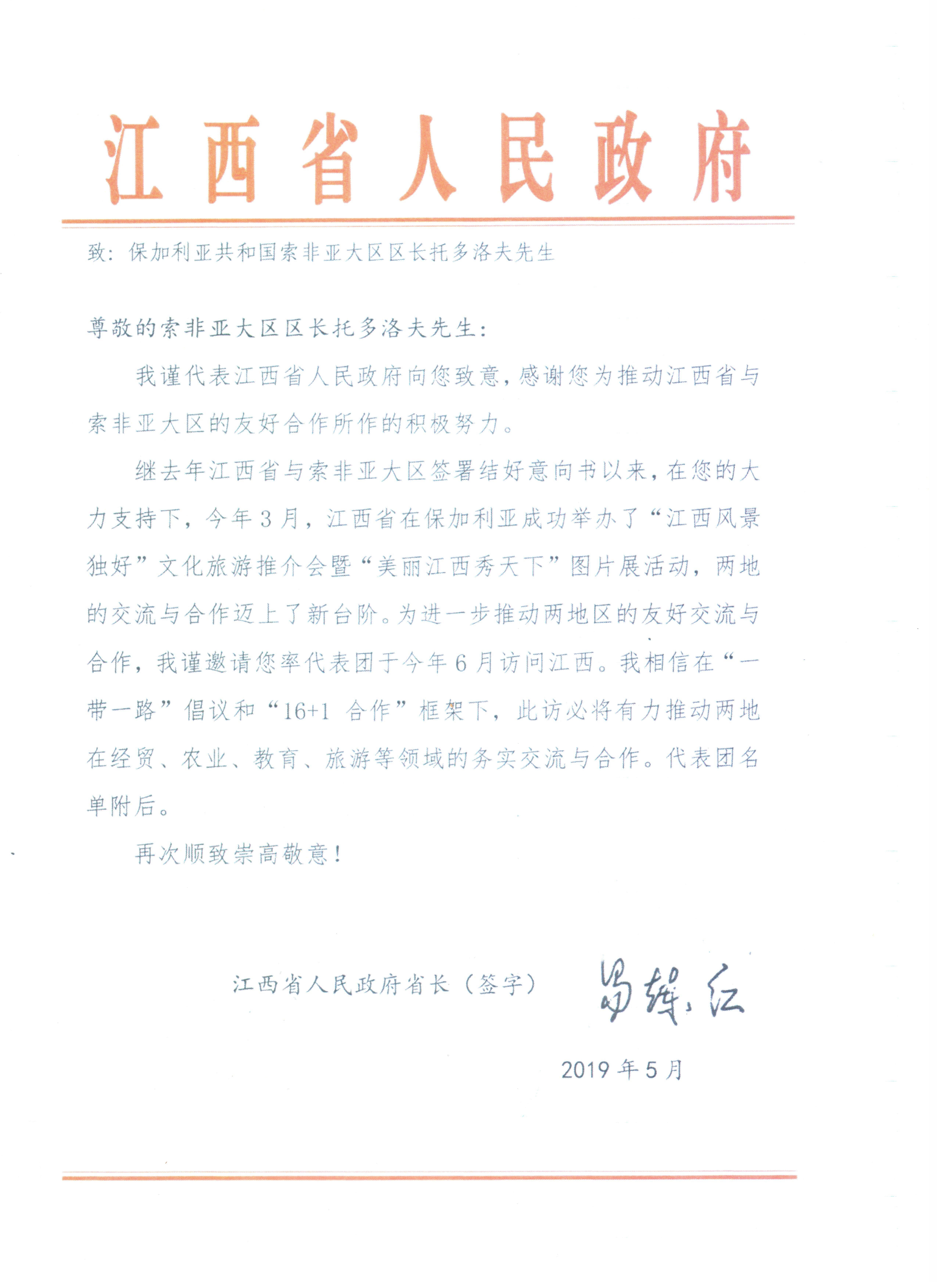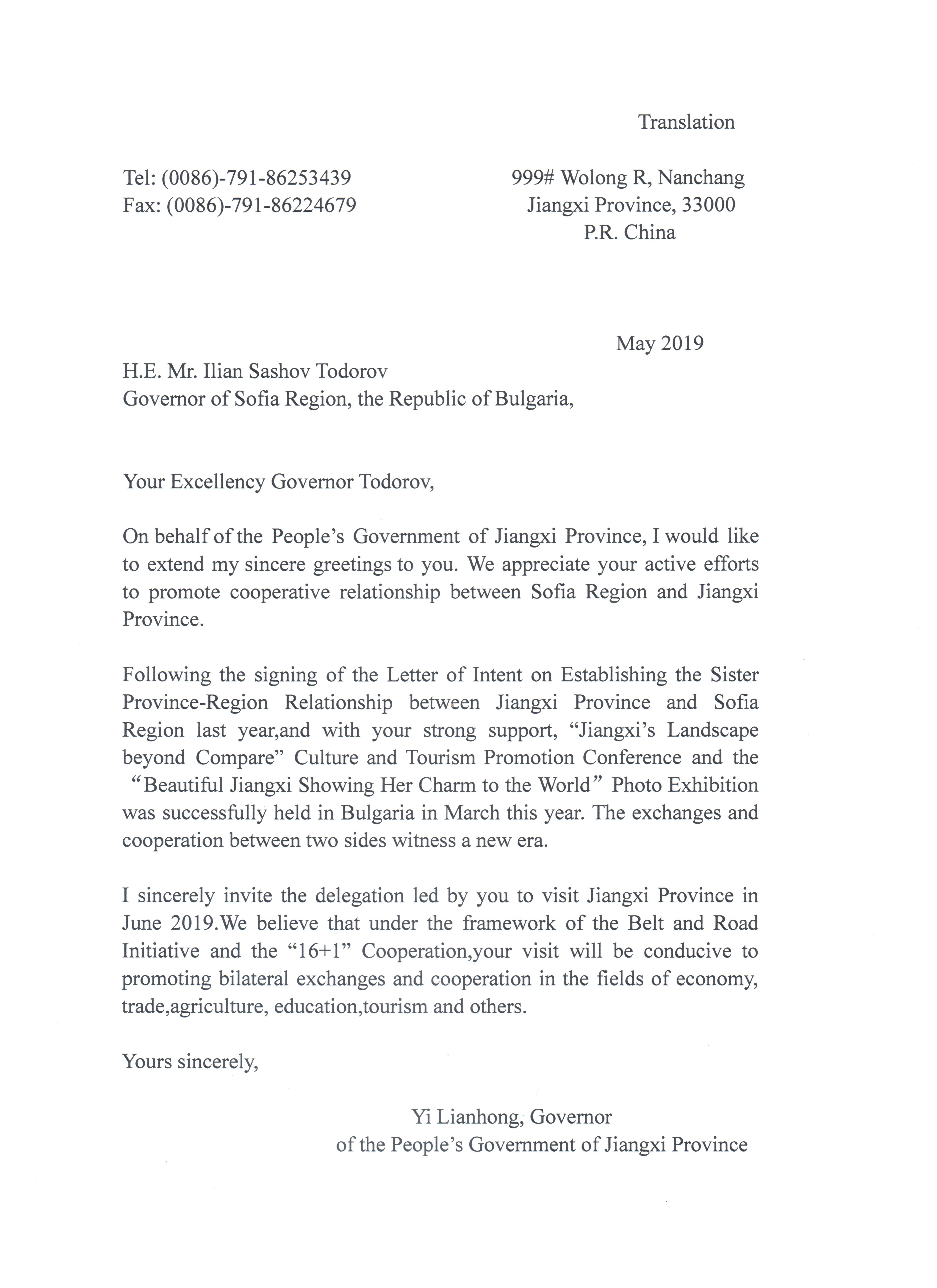 „След подписването на писмото за намерение за установяване на сътрудничество между провинция Джянси и Софийска област миналата година и с Вашата силна подкрепа, се проведоха фотоизложбите в България „Джянси в пейзаж без сравнение“ и „Красивата Джянси“, показващи очарованието на провинцията“, пише в писмото си до Тодоров губернаторът на Джянси.