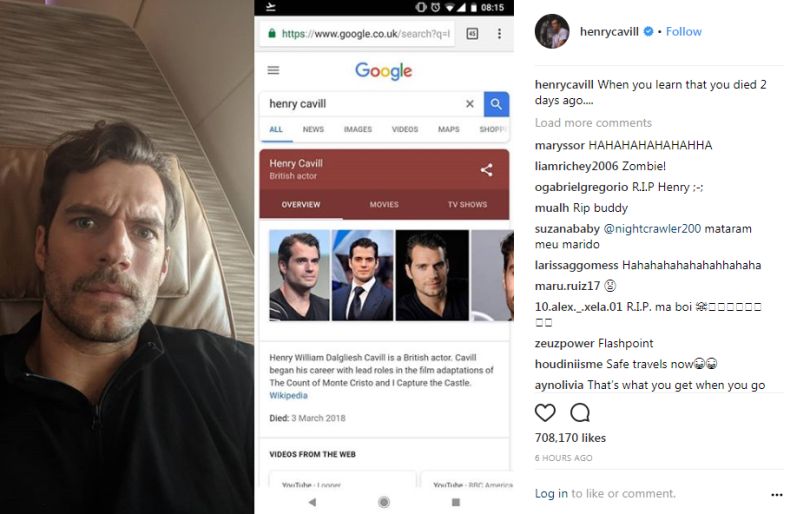 В описанието си към снимката актьорът пише, че на лицето му е емоцията на човек, който е разбрал, че е починал преди два дни. Шегата е отбелязана с "Лайк" от 350 хиляди последователи, а над 20 хиляди почитатели на Хари Кавил са оставили коментари.