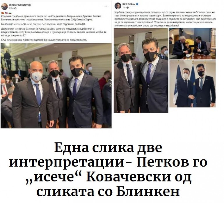 От “Вечер“ пишат, че първо снимката е публикувана от Ковачевски и на нея са тримата, но няколко часа по-късно, министър-председателят на България Петков, публикува същата снимка с Блинкен в профила си във Фейсбук, но без Ковачевски.
