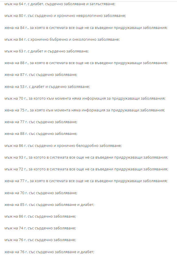 Подчинените на Сербезова обаче са посочили с едно по-малко в разбивката си за починалите, възрастта им и придружаващите ги заболявания. Всички починали са на възраст между 43 и 91 години.