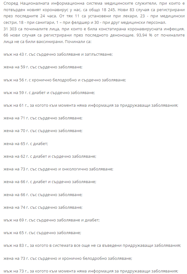 С починалите 66 души от последното денонощия, общият брой на сънародниците ни, погубени от COVID-19 набъбна на 31 303.