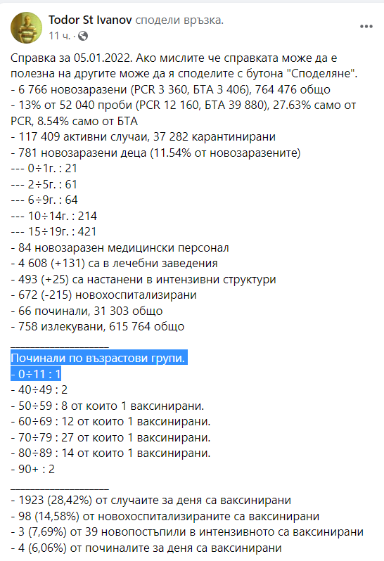 Никъде в сводката от ведомоството на Сербезова не е посочено, че сред починалите има и дете. Данни за това обаче изнесе Порталът за отворени данни, както и математикът Тодор Иванов (на последната снимка).