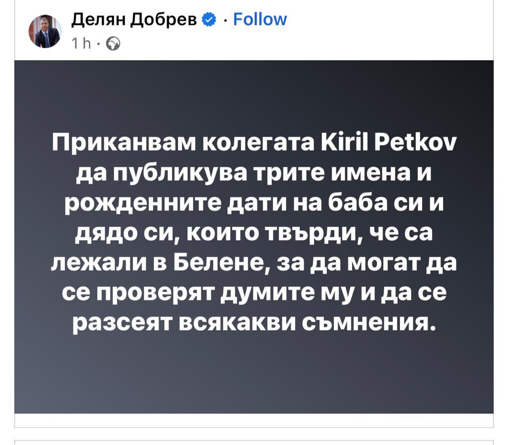 “Приканвам колегата Kiril Petkov да публикува трите имена и рожденните дати на баба си и дядо си, които твърди, че са лежали в Белене, за да могат да се проверят думите му и да се разсеят всякакви съмнения“, написа той.