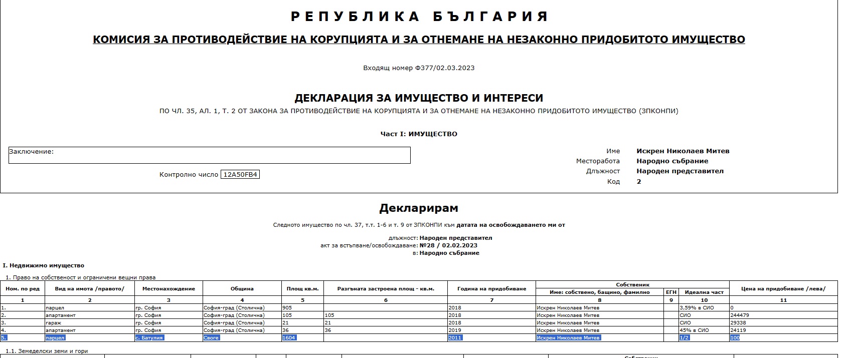Справка в КПКОНПИ, където Искрен Митев е подал декларация, доказва твърденията на Цончо Ганев. Наистина през 2011 г. той купува 1604 квадратни метра парцел в село Батулия, община Своге, за сумата от 100 лева. Селото се намира на 40 километра от София и е известно с реката, която минава през него. В района има изключително много вили и е все по-атрактивно място място за живот. В момента парцел със същите размери струва стотици пъти по-скъпи - между 20 000 и 40 000 лева.