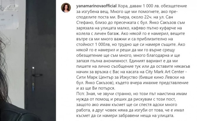Тя моли потребителите да разпространят информацията, че е готова да откупи личните си вещи срещу 1000 лева, като обяснява, че по късни доби е зарязала "малко куфарче на колела" на ул. "Сан Стефано", близо до пресечката с бул. "Янко Сакъзов", пълно с личен багаж.