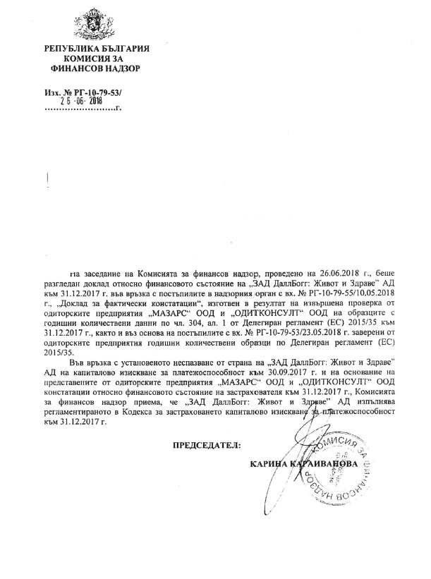 ДаллБогг е изключително рентабилно, прозрачно и стабилно застрахователно дружество. С потвърдена капиталова адекватност от международни и български одиторски компании от 131%. В последвалото писмо от КФН от 26.06.2018 г. се казва: ”КФН разгледа доклада за финансовото състояние на ДаллБогг и въз основа на резултатите от извършените проверки и потвърди, че дружеството изпълнява регламентираното в Кодекса на застраховането капиталово изискване за платежоспособност” (вж приложения документ).Още през месец февруари 2018 г с решение на УС на НББАЗ се прекрати мониторинговата процедура на дружеството.
