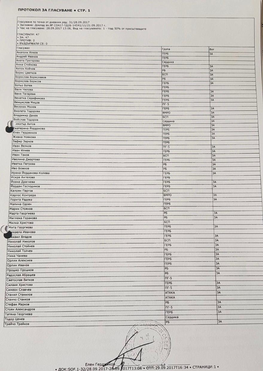 В подкрепа на решението за сделката са гласували общински съветници от всички политически партии – общо 47 души, като сред тях са вносителят на сигнала до прокуратурата г-н Иво Божков, както и г-н Трайчо Трайков и г-жа Марта Георгиева. Към настоящия момент г-н Божков и г-жа Георгиева са съветници от ДБ в СОС, а г-н Трайков е районен кмет на район „Средец“ от същата партия. От фактите се вижда, че сега съветниците от ДБ подават сигнал срещу себе си. Логичен е въпросът, ако са имали съмнения за сделката, защо не са ги изразили, а са я подкрепили през 2017 г. ? И тримата са гласували „За“ сделката и то няколко пъти - както на сесия, така и в заседанията на две комисии в общинския съвет.