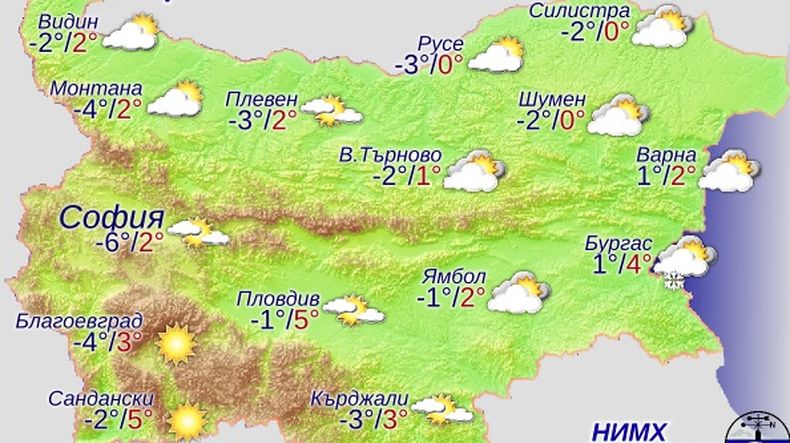 Северният вятър в Източна България ще отслабне до умерен, в останалата част от страната ще духа слаб източен вятър. Максималните температури ще са между 0 и 5 градуса.