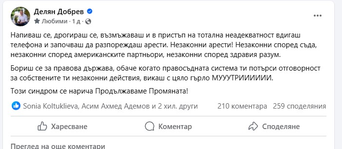 Напиваш се, дрогираш се, възмъжаваш и в пристъп на тотална неадекватност вдигаш телефона и започваш да разпореждаш арести. Незаконни арести! Незаконни според съда, незаконни според американските партньори, незаконни според здравия разум. Това коментира на страницата си във Фейсбук депутатът от ГЕРБ Делян Добрев по повод искането на имунитета на Кирил Петков от страна на главния прокурор Борислав Сарафов вчера.