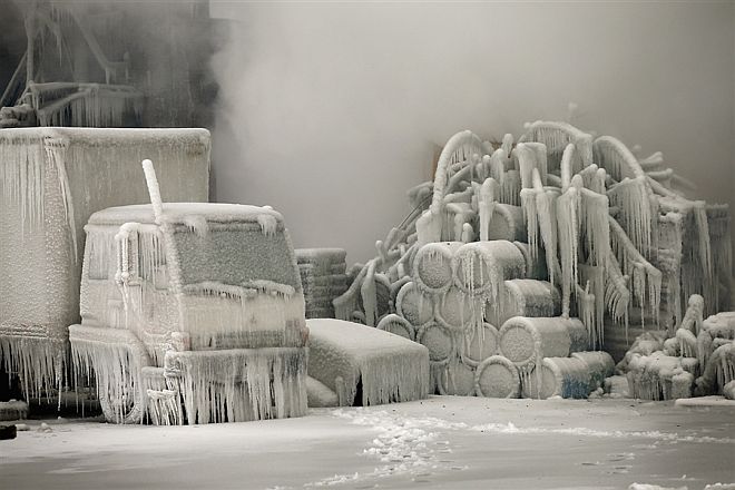 4.Пожарникари гасиха с вода пожар в складове в Чикаго при минусови температури, в резултат на това всичко наоколо се превърна в ледени скулпутри