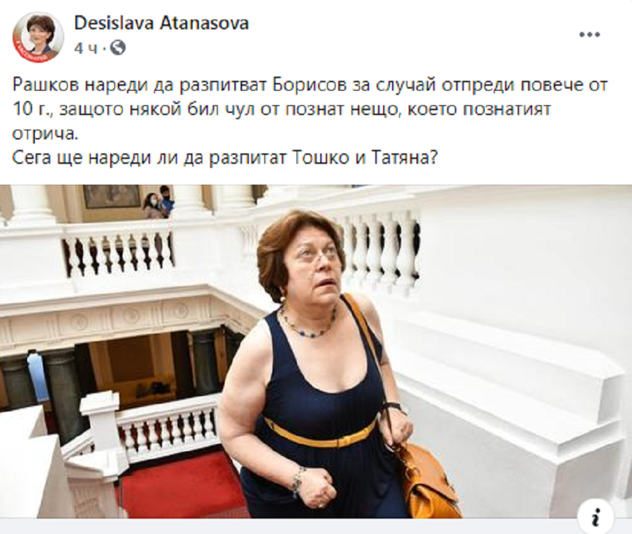Дали вътрешният министър ще нареди да бъдат разпитани Тошко Йорданов и Татяна Дончева. Това попита в социалната мрежа председателката на парламентарната група на ГЕРБ Десислава Атанасова.
