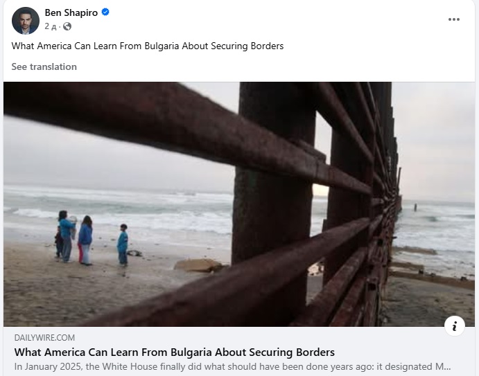 Бен Шапиро, споделяйки статия в “The Daily Wire” на българския политически анализатор Георги Харизанов, написа буквално следното: „Какво Америка може да научи от България за охраната на границата“. А това е вече тотално обръщане на наратива и няма нищо общо с отровната предателска помия, с която България беше заливана от години от кръжеца около Иван Кръстев и „добрите“ медии на „Америка за България“.