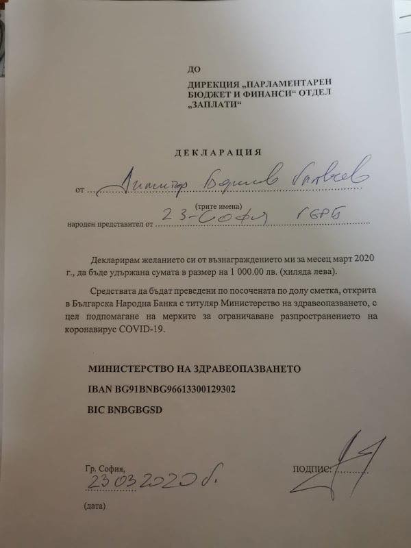 "Днес в НС обсъждаме повторно Закона за мерките и действията по време на извънредното положение, обявено с решение на Народното събрание от 13 март 2020 г. С колегите от ГЕРБ, направихме и това", съобщи Главчев и публикува и снимка от декларацията, с която депутатите от ГЕРБ заявяват желанието си да дарят по 1000 лв. от заплатите си и те да бъдат преведени на Министерство на здравеопазването.