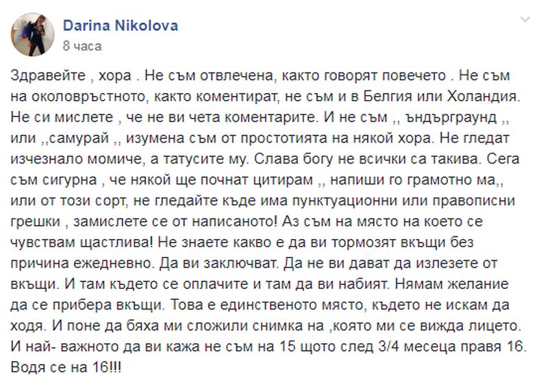 Полицията в Сливен издирва 15- годишната Дарина Николова, а роднините нямат връзка с нея от 2 март тази година. Преди минути, от профила на тийнейджърката във Фейсбук бе написан пост в групата Born in Sliven. Изчезналото момиче обяснява, че не е отвлечена, нито пък е в чужбина, а на място, където е щастлива.Освен това тя пише и потресаващи подробности за живота й преди изгубването на връзка с нея.