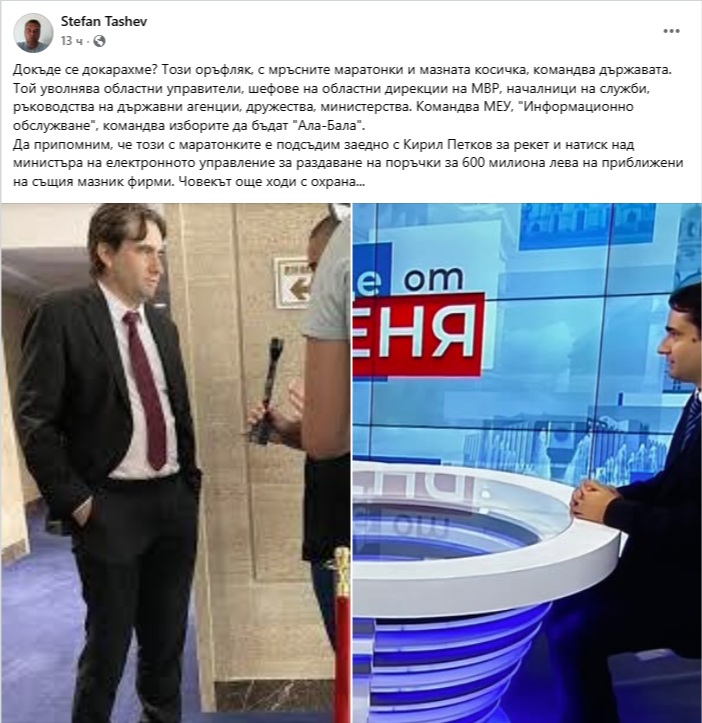 Да припомним, че този с маратонките е подсъдим заедно с Кирил Петков за рекет и натиск над министъра на електронното управление за раздаване на поръчки за 600 милиона лева на приближени на същия мазник фирми. Човекът още ходи с охрана...“, пише гневно Ташев.