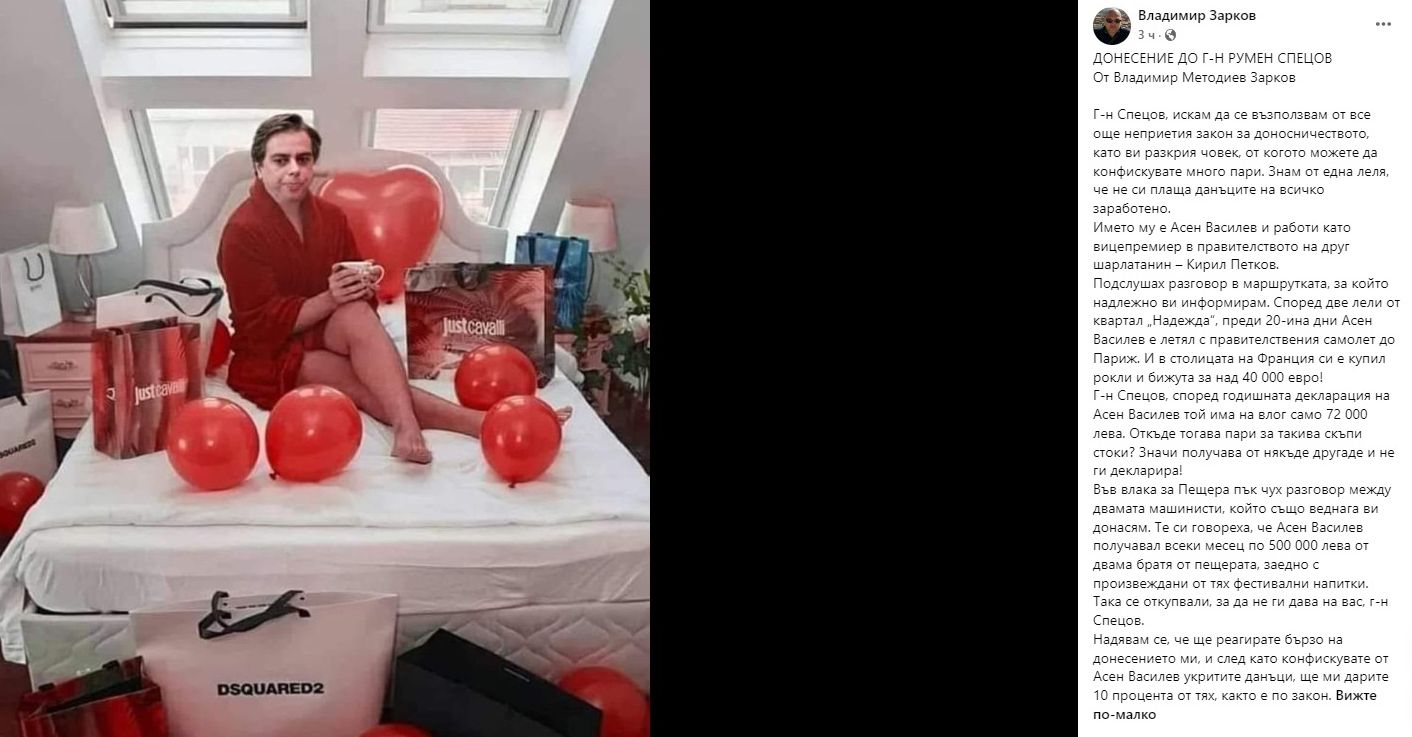 Надявам се, че ще реагирате бързо на донесението ми, и след като конфискувате от Асен Василев укритите данъци, ще ми дарите 10 процента от тях, както е по закон", гласи донесението на Зарков.