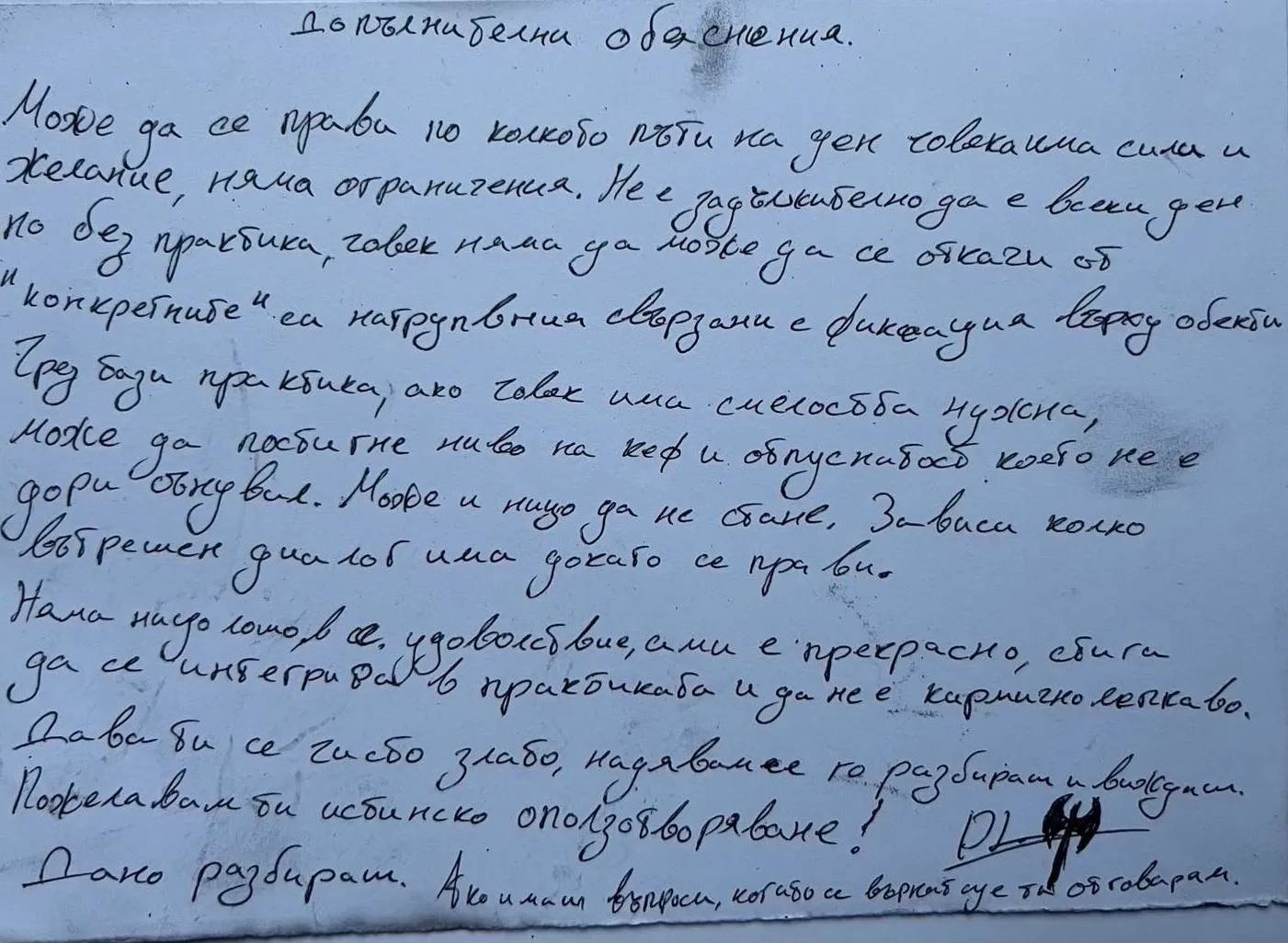 • Емоционална експресивност, комбинирана с манипулативен потенциал - умереният наклон и нуждата от контакт сочат умение да печели доверие, особено сред уязвими хора. Същата ръка, която пише "без срам, без вина, с радост и кеф", е писала и списъците с лицата и НПО-тата, свързани с ПП-ДБ.